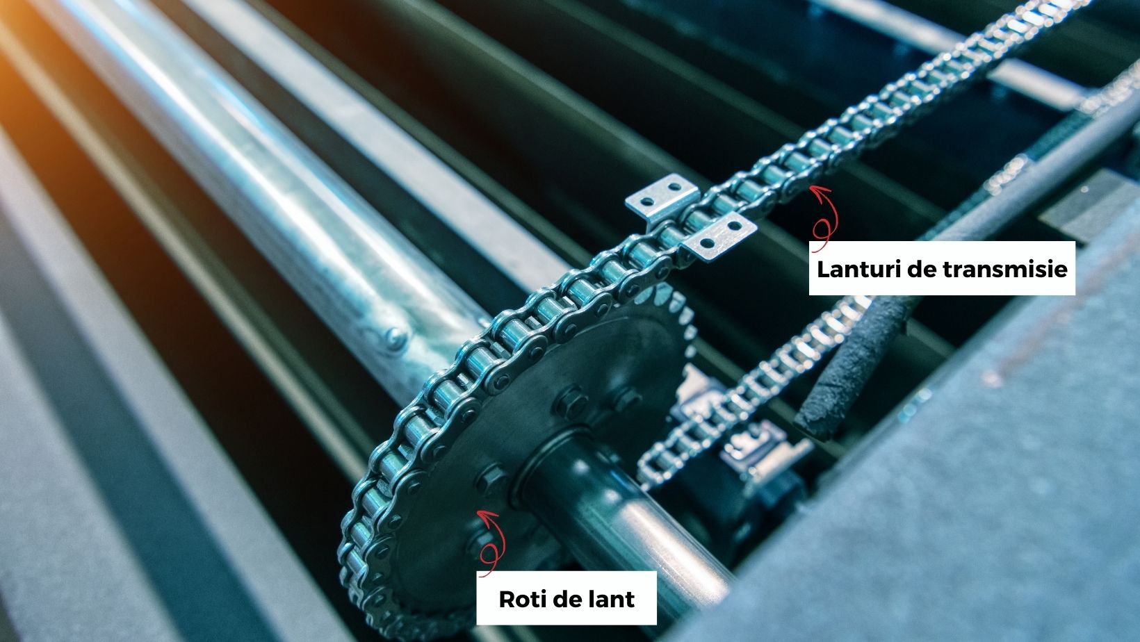 - Lanturile de transmisie – Fabricate din otel de inalta calitate, acestea asigura transmiterea eficienta a miscarii si a fortei intre roti dintate. Lanturile pot fi de diferite tipuri: lanturi cu role, lanturi simple, duble sau triple, in functie de aplicatie.